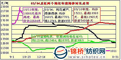 2.現(xiàn)貨棉價上漲4680元,漲幅26%。隨著儲備棉競價大幅上揚,現(xiàn)貨棉價加緊追趕。棉價由月初的18005元/噸上升至月末的22684元/噸,累計上漲4680元,漲幅達26%,接近2009/10年度全年度5000元漲幅。其中9月13-30日半個月時間累計上漲4453元,漲幅24.9%,占9月全月漲幅的93%。價格水平和上漲幅度遠遠高于歷史波動最劇烈的2003/04棉花年度(如下圖)。與此同時,新棉收購價也全線創(chuàng)5元/斤歷史紀錄,折皮棉收購成本達21000-22000元/噸。因為收購成本過高,風(fēng)險太大,大型棉花收購企業(yè)均未參與收購。