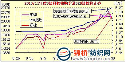 4.籽棉收購5元/斤左右,創(chuàng)新紀(jì)錄。受持續(xù)陰雨氣候影響,新棉收購相應(yīng)推遲。因?yàn)樾旅薜燃壪鄬^低,收購價偏高,目前僅少部分個體或小型商收購,中大型棉花經(jīng)營企業(yè)多在觀望,估計10月中旬后規(guī)模收購將開始。從目前收購情況看,隨著國儲棉價格上揚(yáng)變化,收購價也呈上升走勢,3級籽棉收購價已經(jīng)上升至5元/斤左右,折皮棉達(dá)21000-22000元/噸,收購成本也創(chuàng)出歷史新紀(jì)錄。預(yù)計后期價格有可能理性回調(diào),但是收購成本不會低于2009年的3.4-3.6元/斤水平。