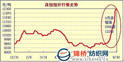 6.滌短、粘短大漲2000元以上,漲幅分別達(dá)26.7%和15.3%。因?yàn)槊迌r大幅上揚(yáng),紡企調(diào)整產(chǎn)品結(jié)構(gòu)增加化纖用量,加上滌短、粘短庫存壓力不大,9月滌短、粘短價格大幅上漲。9月滌短打破8月整理格局大幅上漲2580元至12250元/噸,漲幅達(dá)26.7%;粘短在8月止?jié)q回升后,9月漲幅加大,主體價上漲2720元至20600元/噸,漲幅15.3%。