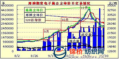 鄭棉期貨主體價由27241元漲至11月10日的32979元,漲5738元,漲幅21.1%(9-11月上旬鄭棉期貨累漲1.36萬元,漲幅70.3%)。之后下跌8033元至月末的24946元,跌幅24.4%,在抵消11月當(dāng)月漲幅的同時,價位水平已經(jīng)回復(fù)到10月下旬水平。持倉總量由最高時的48.26萬手降至42.64萬手。
