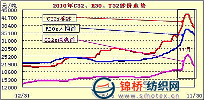 11月32支棉紗先由34500元漲至43000元后又跌回至37000元,即先漲8500元后又下跌6000元,快于棉價跌幅,而且每次下調(diào)幅度都在千元左右;30支人棉紗先由29500元漲至36500元后跌回至34000元,即先漲7000元后又下跌2500元;32支純滌紗由19200元漲至25500元后回至20500元,即先漲6300元后又跌5000元。紗線市場觀望濃郁,市場較低迷,仍然面臨繼續(xù)下調(diào)壓力。由于下游棉紗市場低迷狀況,也加速棉價的下調(diào)。
