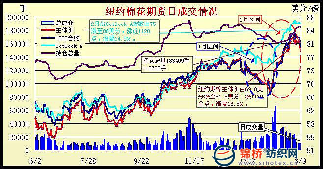 【本網(wǎng)專(zhuān)稿】受美國(guó)農(nóng)業(yè)部全球棉花預(yù)測(cè)報(bào)告和美棉出口周報(bào)利好數(shù)據(jù)刺激,2月尤其是春節(jié)前后,棉價(jià)發(fā)生劇烈變化,演繹出長(zhǎng)達(dá)1個(gè)月直線(xiàn)飚漲行情。1個(gè)月內(nèi)紐約期棉、美棉現(xiàn)貨、CotlookA指數(shù)漲幅均超過(guò)15%,不僅填補(bǔ)1月下跌缺口,價(jià)格水平也都攀升到近2年高點(diǎn)。春節(jié)后國(guó)內(nèi)棉價(jià)急速跟進(jìn),鄭棉期貨節(jié)后第1個(gè)交易日大幅補(bǔ)漲達(dá)500元以上,漲幅接近漲停板,價(jià)格全線(xiàn)接近或超過(guò)16000元。此后以漲多跌少,量?jī)r(jià)配合高位震蕩。國(guó)內(nèi)棉花現(xiàn)貨市場(chǎng)借力發(fā)威,各產(chǎn)棉區(qū)報(bào)價(jià)普遍上調(diào)200-300元,棉價(jià)全線(xiàn)突破15000元關(guān)口,且持續(xù)在上行通道中運(yùn)行。2月國(guó)內(nèi)、外棉價(jià)巨幅波動(dòng),給剛剛從金融危機(jī)中擺脫出來(lái),正處企穩(wěn)回升的紡織生產(chǎn)企業(yè)增加不小壓力。 一、2月各主要棉花市場(chǎng)棉價(jià)變動(dòng)簡(jiǎn)況 1.紐約期棉漲至86.55美分歷史高位,漲1170余點(diǎn),漲幅達(dá)16.8%。紐約期棉在經(jīng)過(guò)1月向下調(diào)整600余點(diǎn)后,2月尤其是春節(jié)期間,量?jī)r(jià)配合,以平均每日100點(diǎn)加速度直線(xiàn)飚漲,主體價(jià)由1月末的69.78美分迅速漲至2月末的81.49美分,是2007年度來(lái)最高價(jià)位,漲1171點(diǎn),1個(gè)月間累計(jì)漲幅達(dá)16.8%。其中近期1003合約2月末收于82.61美分,1個(gè)月累漲1358點(diǎn),漲幅19.7%。2月日均總成交量達(dá)3萬(wàn)余手,比1月日增1.4萬(wàn)手,增幅88.4%。 2.國(guó)際棉價(jià)CotlookA指數(shù)達(dá)86.55美分,漲1120余點(diǎn),漲幅14.9%。在紐約期棉帶動(dòng)下,2月各產(chǎn)棉國(guó)棉價(jià)頻頻上調(diào),其中印度棉累漲800余點(diǎn);非洲棉漲1000余點(diǎn);美棉漲近1200點(diǎn)等。國(guó)際棉價(jià)CotlookA指數(shù)2月末達(dá)86.55美分,較1月末漲1120余點(diǎn),漲幅14.9%。由于國(guó)際棉價(jià)漲幅快于國(guó)內(nèi),內(nèi)外棉價(jià)倒掛,外棉價(jià)格優(yōu)勢(shì)削弱。截止到2月26日,CotlookA指數(shù)按1%關(guān)稅折口岸價(jià)約合14890元,較1月末漲1750元,與國(guó)內(nèi)現(xiàn)貨差額不足100元;按滑準(zhǔn)稅率折口岸價(jià)是15400元,與現(xiàn)行國(guó)內(nèi)棉價(jià)倒掛400余元以上。紐約期棉與國(guó)際棉價(jià)自去年6月來(lái)走勢(shì)圖示如下: