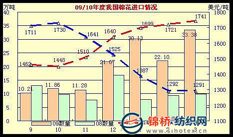 據(jù)海關(guān)統(tǒng)計,3月我國進(jìn)口棉花32.4萬噸,環(huán)比2月增長46.5%,同比增長2.3倍。2010年1季度累計進(jìn)口棉花84.6萬噸,同比增長2.1倍。2009年度前7個月累計進(jìn)口棉花139.7萬噸,同比增長88.8%。進(jìn)口棉價格繼續(xù)上漲,3月平均1741美元/噸,較2月上漲1.2%,同比上漲34.9%。
