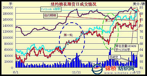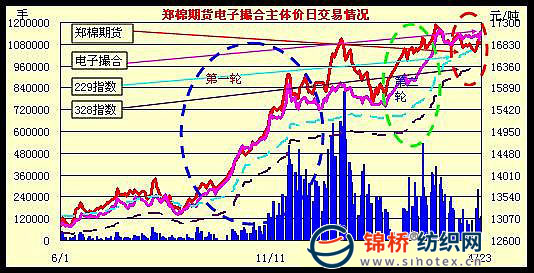 本年度棉市出現(xiàn)2輪較大漲情,第1輪是2009年10-11月,第2輪是2010年春節(jié)前后??v觀2輪行情變化,共同點(diǎn)是因?yàn)楣┬枞笨?,資源供應(yīng)緊張,價格均漲千元以上。不同點(diǎn)是,前者是是先國內(nèi),后國際、先現(xiàn)貨,后期貨。后者則反之,先國際,后國內(nèi)、先期貨,后現(xiàn)貨。4月因?yàn)橛《裙紩和C藁ǔ隹谡?,又引發(fā)出新1輪棉花上漲行情。經(jīng)過幾輪棉價變動,棉價水平均接近歷史高位。截止4月23日本年度國內(nèi)328級棉價指數(shù)已經(jīng)漲至16350元,累計上漲3250元左右,漲幅達(dá)24.8%,較2009年最低時漲幅57%;電子撮合主體價17100元,漲3450元,漲幅25.3%;鄭棉期貨主體價16860元,漲3160元,漲幅23.1%。與此同時,紐約棉花期貨主體價達(dá)83.7美分,漲22.8美分,漲幅37.4%;國際棉價A指數(shù)90.9美分,漲27.4美分,漲幅43%。國內(nèi)外棉價走勢圖如下: