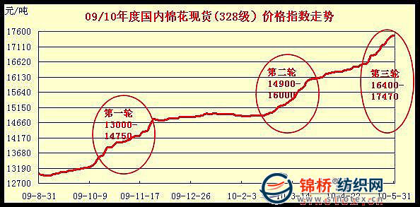 第1輪是在2009年10-11月,棉價由13000元漲至11月末的14750元,2月上漲1750元,漲幅13.5%;
