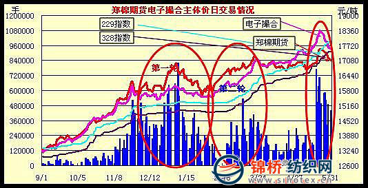 鄭棉期貨主體價由年度初期的1.33萬元漲至最高時的1.756萬元,累計上漲4260元,漲幅32%,比2009年最低時的1.03萬元上漲7260元,漲幅達(dá)70.5%。5月鄭棉期貨日均成交量37.74萬手,比4月增加22.95萬手,是4月的2.6倍,是2009年5月的20.5倍;日均持倉量38.4萬手,比4月增加5.76萬手,增幅17.6%,是2009年5月的6.1倍。受5月下旬增發(fā)80萬噸棉花進(jìn)口配額及印度可能取消限制棉花出口禁令,月末2個市場行情微有下調(diào)。電子撮合和鄭棉期貨成交圖示如下: