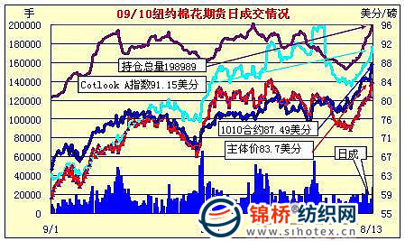 截止8月13日,紐約期各合約主體價83.7美分/磅,比今年4月份最高價位微低36點,較7月中旬上漲1048點,漲幅14.3%。其中本周漲374點,漲幅4.7%。各合約持倉總量達(dá)19.9萬手,為近兩年來新高,比7月中旬增倉4.04萬手,增幅25.5%。其中本周增倉1.31萬手,增幅7.1%。