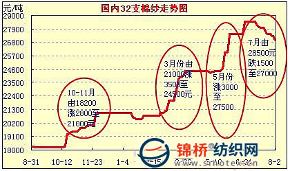 2.國內(nèi)現(xiàn)貨棉價7月小幅回落,期貨寬幅震蕩,紗價先于棉價下調(diào)。6月后半月持續(xù)火暴的紗線悄然轉(zhuǎn)弱,出口下降、價格回落。在缺乏棉紗支撐,加上棉花進口配額下發(fā)、拋儲信息發(fā)布和國家將加大對農(nóng)產(chǎn)品炒作打擊力度等因素影響,7月來游資開始紛紛逃離棉花、棉紗市場,棉紗價格大幅下跌,棉價開始止?jié)q下調(diào)。