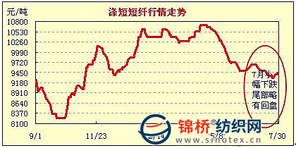 3.滌短跌后趨穩(wěn),粘短持續(xù)下跌。滌短在經(jīng)過5-6月由10650元跌持續(xù)下滑至9480元后,7月中上旬仍然貫性下行,但是下跌幅度縮小。7月下旬隨著聚酯原料底部反彈,滌短微有翅尾,滌短主體價由9300元又回復(fù)到9480元/噸。由于底部區(qū)域已經(jīng)基本形態(tài),隨著新棉上市推遲,短期內(nèi)滌短仍然將以小幅上行為主。