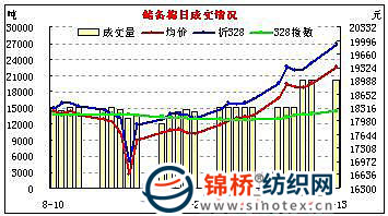 2、國(guó)儲(chǔ)棉競(jìng)拍情況:9月13日儲(chǔ)備棉成交價(jià)大幅上漲,最高價(jià)達(dá)2萬(wàn)。當(dāng)日儲(chǔ)備棉投放數(shù)量為20081.73噸,歷時(shí)約八個(gè)小時(shí)全部成交;平均等級(jí)4.03,較10日低0.07;平均長(zhǎng)度28.22,與10日相比高0.02;加權(quán)平均成交價(jià)19352元/噸,較10日漲422元,折328級(jí)成交價(jià)為19906元/噸,較10日漲466元。
