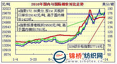 這一時期,在國內(nèi)棉價(jià)溫和整理的同時,紐約期棉則在美國經(jīng)濟(jì)數(shù)據(jù)趨好及印度棉花出口政策不穩(wěn)定的情況下,連續(xù)大幅反彈,并引領(lǐng)國際棉價(jià)持續(xù)上揚(yáng)。在12月份的22個交易日中,紐約期棉有10個交易日觸及漲停板,主體價(jià)最高時達(dá)144美分以上,首期1103合約再刷歷史新高,最高沖至159美分。CotlookA指數(shù)攀升至186美分/磅新高,按滑準(zhǔn)稅折口岸價(jià)達(dá)31600元以上,大大高于我國內(nèi)棉價(jià)。從走勢圖形看,12以來,由于國內(nèi)棉價(jià)對國際棉價(jià)走勢未給予反應(yīng),導(dǎo)致國際棉價(jià)首次大幅高于國內(nèi)棉價(jià)的同時,也使國際棉價(jià)漲勢受到抑制,回調(diào)震蕩整理。