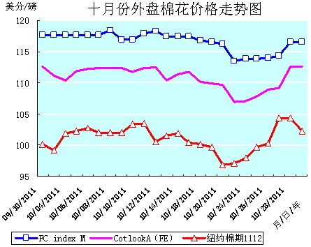 縱觀十月份的ICE期棉,乃是在弱勢盤整行情中先抑后揚(yáng),小幅上漲的波動走勢,運(yùn)行波峰在28日,波谷在20日。10月全月,紐約棉期1112合約累計(jì)上漲2.10美分/磅,漲幅2.10%,月末運(yùn)行在102.29美分/磅價位上。國際棉花價格指數(shù)CotlookA(FE)累計(jì)下降0.05美分/磅,降幅0.04%,月末運(yùn)行在112.60美分/磅的價位上。中國進(jìn)口棉價格指數(shù)FCIndexM累計(jì)下降1.17美分/磅,降幅0.99%,月末運(yùn)行在116.55美分/磅價位上。國際棉花指數(shù)ICindexM累計(jì)下降3.70美分/磅,降幅2.92%,月末運(yùn)行在123.10美分/磅價位上。(參見:表一和十月份外盤棉花價格走勢圖)