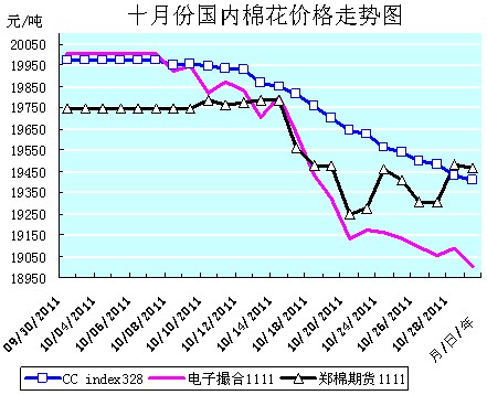 總體上看,十月份的上、中旬ICE期棉是弱勢盤整運(yùn)行,價格下降的走勢,10月20日降至本月的谷底,主力紐約棉期1112合約創(chuàng)出自8月11日以來的最低價位。下旬21日起反彈回升,給出“六連陽”的強(qiáng)力走勢,且27日收于漲停版。月末最后一日(31日),因?yàn)闅W債危機(jī)的解決方案引發(fā)市場擔(dān)憂,外部商品、原油市場大幅走低,加之月底結(jié)清倉位和了結(jié)獲利,期棉受連累,又使期棉合約在7個交易日內(nèi)首日下跌。(參見:表一和十月份外盤棉花價格走勢圖)