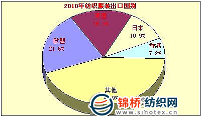 從棉紗線進口來源國別看,歷年來巴基斯坦一直是我國棉紗線進口主要來源國,由于其2010年遭水災,自巴基斯坦進口棉紗線降幅較大,從印度、越南進口增速較明顯,另外自烏茲別克斯坦和美國進口量雖然不大,但是增幅較大。2010年我國自巴基斯坦進口棉紗線33.67萬噸,比上一年下降12.2%;自印度進口12.73萬噸,增長68%;自越南進口10.75萬噸,增長38.6%。另外自烏茲別克斯坦進口2.92萬噸,增長5.1倍;自美國進口1.28萬噸,增長8.4倍。 4.主要出口地區(qū)仍然以歐盟、美國、日本、香港為主,對美國出口比重逐年上升。2010年紡織服裝對歐盟出口446.56億美元,同比增長23.7%,占我國出口比重保持21.6%的水平;對美國出口337.31億美元,同比增長27.7%,比重由2008年的13.7%上升到2009年的15.8%,2010年的16.3%;對日本出口224.47億美元,同比增長5.2%,占我國紡織服總額的10.9%;對香港出口和轉(zhuǎn)口貿(mào)易149.38億美元,同比增長7.1%,比重由2008年的8.6%下降至2009年的8.3%、2010年的7.2%。2010年對上述地區(qū)出口1253.12億美元,同比增長28.1%,占我國紡織服裝出口的56.1%。