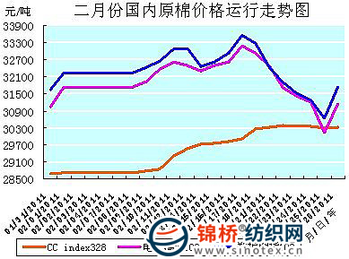反而是前期一直少受外盤干擾,表現(xiàn)堅挺穩(wěn)定的現(xiàn)貨行情,小步快邁,不動聲色加快漲價步伐,現(xiàn)貨CCindex328指數(shù)全月累計上漲1630元/噸,漲幅5.69%,比2010年12月的4.80%和1月的4.27%都高。電子盤上漲遲緩與現(xiàn)貨升漲加速,使得兩者價格日趨一致,越靠越近。25日電子撮合1103合約價位30138元/噸,低于現(xiàn)貨CCindex328指數(shù)價位30298元/噸。雖然兩者僅是短暫“握手”后,第二天即又分道揚鑣,但是兩者價差縮小,卻是市場一直期待“理性“回歸。(參見:二月份原棉價格運行明細表和二月份原棉價格運行走勢圖)