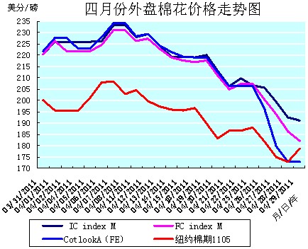 四月中旬后,外盤棉價(jià)就進(jìn)入了連續(xù)下滑的通道。主要是因基本面利空,包括中國(guó)棉花市場(chǎng)需求減弱、銷滯價(jià)跌導(dǎo)致的取消美陸地棉出口簽約,南半球新上市棉花價(jià)格較低,以及普爾公司對(duì)美國(guó)的信貸評(píng)級(jí)下調(diào)至“負(fù)面”等諸多因素的綜合影響。至月底,外盤棉價(jià)均已跌破200美分/磅的整數(shù)線,紐約棉期1105合約4月12日就跌破了200美分/的整數(shù)線,月末運(yùn)行在178.78美分/磅的價(jià)位上;CotlookA(FE)指數(shù)4月26日也跌破了200美分/的整數(shù)線,月末運(yùn)行在172.70美分/磅的價(jià)位上。