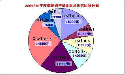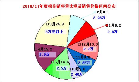 與上一年度相比,從收購進度看與今年基本相似,收購量相對集中于9-10月份,兩月收購471萬噸,占當年收購總量的73.8%,收購均價為13000元/噸。但棉花銷售價格變動幅度不大,銷售坡度也相對均穩(wěn)。
