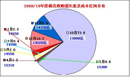 從新棉收購及成本情況看,收購量多集中于去年9-12月份,這一區(qū)間收購量約占本年度新棉收購總量的88.7%,平均收購成本約為21900元/噸,為本年度來收購成本最低區(qū)間。其中9-10月收購402萬噸,占68.7%,平均收購成本20860元;11月份收購69萬噸,占11.7%,收購成本26380元;12月份收購48萬噸,占8.3%,收購成本24200元/噸。而本年度收購成本最高區(qū)間較為集中于今年2、3月份,收購成本分別達27060元和27780元/噸,但這一區(qū)間收購量分別僅為20和14萬噸,僅占收購總量5.8%。