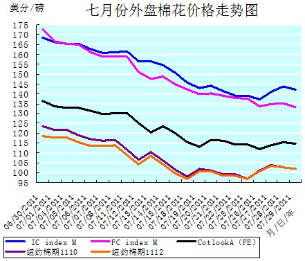 7月份外盤棉花行情總體上缺乏方向指引,市場觀望氣氛濃厚,行情震蕩盤整、走勢疲弱下行,表現(xiàn)為蛇形蜿蜒波動、大幅滑落下降的運行態(tài)勢。7月全月,紐約棉期1110合約累計下降21.61美分/磅,降幅17.47%,月末運行在102.08美分/磅的價位上。國際棉花價格新棉指數(shù)CotlookA(FE)累計下降21.45美分/磅,降幅15.73%,月末運行在114.90美分/磅的價位上。中國進口棉價格指數(shù)FCIndexM累計下降39.34美分/磅,降幅22.77%,月末運行在133.41美分/磅的價位上。國際棉花指數(shù)ICindexM累計下降26.34美分/磅,降幅15.63%,月末運行在142.14美分/磅的價位上。(參見:表一和7月份外盤棉花價格走勢圖)