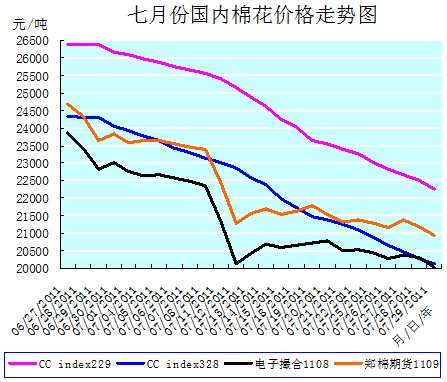 7月份國內(nèi)棉市上不管是電子盤棉價,還是現(xiàn)貨棉價,都是與外盤同步大幅下滑的疲弱走勢。棉價下降的幅度比6月份有大幅的擴展,交易卻并未走出觀望、萎靡不振的清冷氛圍。唯一不同的是現(xiàn)貨棉價走出1條勻速大幅下降的平滑坡形曲線。電子盤棉價因為與外盤棉價的相互影響,故而走出的是1條與外盤ICE期棉相似的跌宕起伏的蛇形蜿蜒波動、大幅滑落下降的曲線。