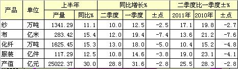 據(jù)國(guó)家統(tǒng)計(jì)局統(tǒng)計(jì),2011年上半年,全國(guó)紡織行業(yè)完成產(chǎn)值25022.37億元,同比增長(zhǎng)30%。其中一季度增長(zhǎng)31.6%,二季度增長(zhǎng)28.8%,二季度比一季度增速下降2.8個(gè)百分點(diǎn)。