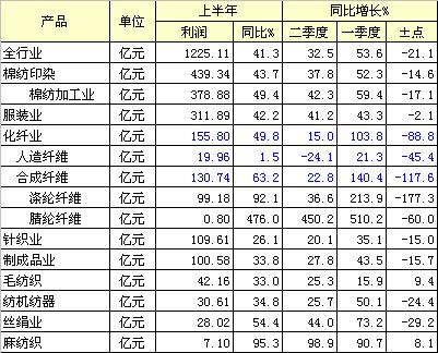 從分行業(yè)利潤(rùn)總額情況看,增速雖高位回落,但棉紡織服裝業(yè)好于化纖業(yè),毛、麻紡織業(yè)相對(duì)平穩(wěn)。上半年,棉紡織印染實(shí)現(xiàn)利潤(rùn)439.34億元,同比增長(zhǎng)43.7%,其中二季度增長(zhǎng)37.8%,比一季度下降14.6個(gè)百分點(diǎn)。其中棉紡織加工業(yè)實(shí)現(xiàn)利潤(rùn)378.88億元,同比增長(zhǎng)49.4%,二季度增長(zhǎng)42.3%,較一季度回落17.1個(gè)點(diǎn);服裝業(yè)利潤(rùn)總額311.89億元,同比增長(zhǎng)42.2%,二季度增長(zhǎng)41.2%,比一季度微降2.1點(diǎn);化纖業(yè)利潤(rùn)總額155.8億元,同比增長(zhǎng)49.8%,其中一季度增長(zhǎng)103.8%,二季度增長(zhǎng)15%,比一季度增速下滑88.8個(gè)百分點(diǎn)。其中人造纖維業(yè)一季度增長(zhǎng)21.3%,二季度下降24.1%,比一季度下滑45.4個(gè)點(diǎn),上半年同比微增15%。毛、麻紡織業(yè)上半年同比分別增長(zhǎng)33和95.3%,二季度增速比一季度分別上升9.4和8.1個(gè)百分點(diǎn)。(附表四)