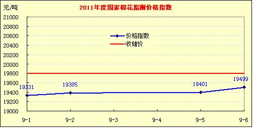 根據(jù)《2011年度棉花臨時收儲預(yù)案》(公告2011年第5號)第七條“國家棉花市場監(jiān)測系統(tǒng)和中國棉花協(xié)會監(jiān)測國內(nèi)棉花、棉籽市場價格水平,取兩單位監(jiān)測的棉花價格平均值和棉籽價格平均值作為國內(nèi)棉花、棉籽市場平均價格,即國家棉花價格B指數(shù)(328)和中國棉花價格指數(shù)(328)的平均值計(jì)算,國家棉花監(jiān)測價格指數(shù)自9月1日開始,已連續(xù)4個交易日低于1980元,按照收儲預(yù)案,當(dāng)監(jiān)測價格指數(shù)連續(xù)五個交易日低于19800元時,啟動收儲之規(guī)定,收儲啟動在即。 2011年度國家棉花監(jiān)測價格指數(shù)