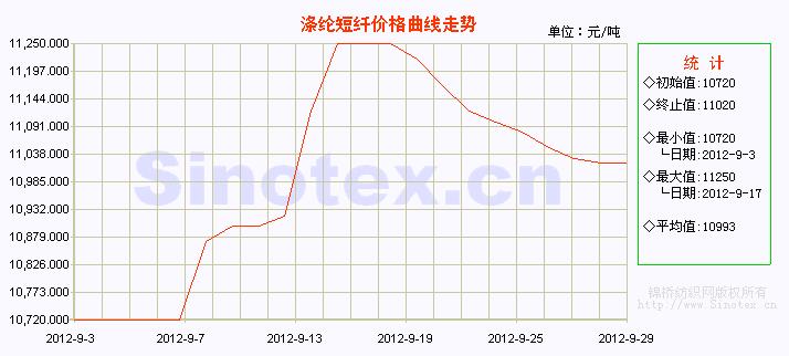 九月份滌綸短纖行情走勢(shì)受上游原料的驅(qū)動(dòng)。9月上旬滌短盤穩(wěn)在10720元/噸的價(jià)位,之后由于上游原料原油、PX市場(chǎng)行情出現(xiàn)大漲,PTA、MEG及聚酯切片價(jià)格大幅跟進(jìn),致使滌短廠家成本堅(jiān)挺,中旬滌綸短纖報(bào)價(jià)不斷上行,于9月17日沖高至11250元/噸高位盤整。隨著國(guó)際原油的連續(xù)重挫,PX市場(chǎng)價(jià)格深跌,PTA、MEG行情盤整下滑,聚酯原料成本面支撐不斷減弱,9月下旬滌綸短纖一直處于弱勢(shì)下滑的狀態(tài)。本月累計(jì)上漲了250元/噸,月漲幅2.32%。 轉(zhuǎn)載本網(wǎng)專稿請(qǐng)注明:"本文轉(zhuǎn)自錦橋紡織網(wǎng)"