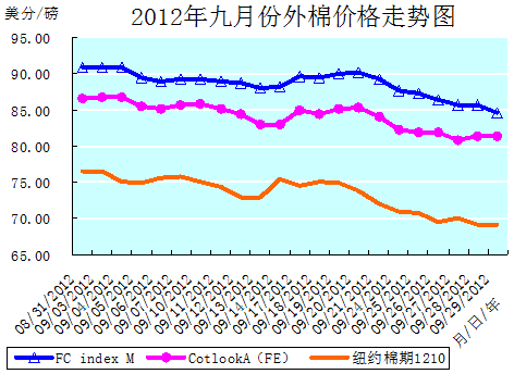 全月統(tǒng)計(jì):紐約棉期1210合約累計(jì)大幅下降7.33美分/磅,降幅9.58%,月末運(yùn)行在69.15美分/磅的價(jià)位上。國際棉花價(jià)格指數(shù)CotlookA(FE)累計(jì)大幅下降5.20美分/磅,降幅6.01%,月末運(yùn)行在81.30美分/磅的價(jià)位上。中國進(jìn)口棉價(jià)格指數(shù)FCIndexM累計(jì)大幅下降6.19分/磅,降幅6.82%,月末運(yùn)行在85.72美分/磅的價(jià)位上。9月末,中國進(jìn)口棉價(jià)格指數(shù)FCIndexM仍然分別高于國際棉花價(jià)格指數(shù)CotlookA(FE)和近期ICE期棉1210合約4.42美分/磅、16.57美分/磅,價(jià)差比上月有所擴(kuò)展。(參見:表一和2012年9月份外棉價(jià)格走勢(shì)圖)