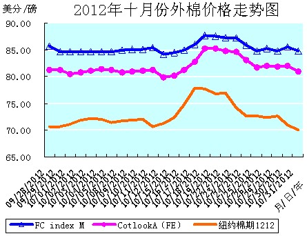 全月統(tǒng)計(jì):紐約棉期1212合約累計(jì)窄幅上漲0.58美分/磅,漲幅0.82%,月末運(yùn)行在70.07美分/磅的價(jià)位上。國(guó)際棉花價(jià)格指數(shù)CotlookA(FE)累計(jì)窄幅下降0.40美分/磅,降幅0.49%,月末運(yùn)行在80.90美分/磅的價(jià)位上。中國(guó)進(jìn)口棉價(jià)格指數(shù)FCIndexM累計(jì)窄幅上漲0.16分/磅,漲幅0.19%,月末運(yùn)行在84.76美分/磅的價(jià)位上。10月末,中國(guó)進(jìn)口棉價(jià)格指數(shù)FCIndexM仍然分別高于國(guó)際棉花價(jià)格指數(shù)CotlookA(FE)和近期ICE期棉1212合約3.86美分/磅、14.69美分/磅,價(jià)差比上月有所收縮。(參見:表一和2012年10月份外棉價(jià)格走勢(shì)圖)