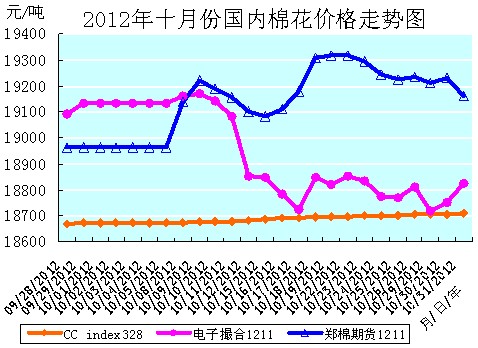 10月份,鄭棉期貨1211合約累計(jì)上漲195元/噸,漲幅1.03%,月末運(yùn)行在19160元/噸的價(jià)位上;電子撮合1211合約累計(jì)大幅下降308元/噸,降幅1.61%,月末運(yùn)行在18825元/噸的價(jià)位上;中國(guó)棉花價(jià)格指數(shù)CCindex328累計(jì)上漲36元/噸,漲幅0.19%,月末運(yùn)行在18709元/噸的價(jià)位上。月末,現(xiàn)貨CCindex328價(jià)格比鄭棉期貨1211合約低451元/噸、比電子撮合1211合約低116元/噸。(參見:表一和2012年9月份國(guó)內(nèi)棉花價(jià)格走勢(shì)圖)