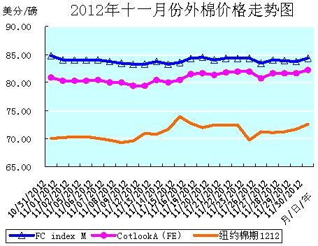 11月份全月統(tǒng)計(jì):紐約棉期1212合約累計(jì)小幅上漲了1.95美分/磅,漲幅為2.76%,月末運(yùn)行在72.65美分/磅的價(jià)位上。國(guó)際棉花價(jià)格指數(shù)CotlookA(FE)累計(jì)小幅上漲了1.30美分/磅,漲幅為1.61%,月末運(yùn)行在82.20美分/磅的價(jià)位上。中國(guó)進(jìn)口棉價(jià)格指數(shù)FCIndexM累計(jì)窄幅下降了0.44分/磅,降幅為0.52%,月末運(yùn)行在84.32美分/磅的價(jià)位上。11月末,中國(guó)進(jìn)口棉價(jià)格指數(shù)FCIndexM仍分別高于國(guó)際棉花價(jià)格指數(shù)CotlookA(FE)和近期ICE期棉1212合約2.12美分/磅、11.67美分/磅。(參見(jiàn):表一和2012年11月份外棉價(jià)格走勢(shì)圖)