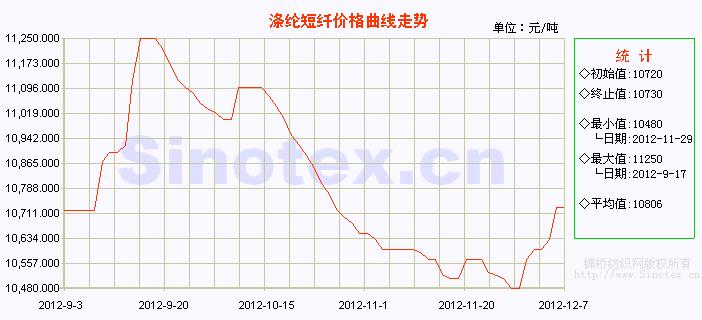 本周(12.3-12.7),原油價格下行為主,但滌綸短纖原料PX、PTA、MEG、聚酯切片卻逆勢全線上漲。受成本面的拉動,滌短廠家報價不斷上調,交投氣氛回升,成交重心上抬,成交量短時放量。滌綸短纖多數(shù)工廠產銷在100-200%,較高在300%。當前,1.4D直紡滌綸短纖市場中心價在10730元/噸,本周累計大幅上漲250元/噸,漲幅2.39%。