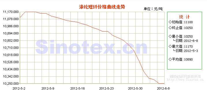 本周(6.4-6.8),國內(nèi)滌綸短纖市場行情疲勢走跌。由于內(nèi)外經(jīng)濟(jì)形勢不穩(wěn),歐債危機(jī)加劇,原油暴跌,全球股市、商品、歐元等風(fēng)險(xiǎn)資產(chǎn)跌至多月以來的最低水平,全球經(jīng)濟(jì)增速放緩。在不利的大環(huán)境下,聚酯纖維產(chǎn)品經(jīng)歷著化纖行業(yè)困境的洗禮與考驗(yàn)。近期棉花、PTA期貨弱勢下挫,直紡滌短價(jià)格隨勢走跌。聚酯市場觀望氣氛濃郁,買盤稀少,成交量不足。下游紡企補(bǔ)貨心態(tài)謹(jǐn)慎,直紡滌短市場商談重心下滑。滌綸短纖開工負(fù)荷基本保持七成的水平,企業(yè)庫存量在十天左右的水平,保持壓力。當(dāng)前,江浙聚酯市場滌綸短纖主流報(bào)價(jià)在10250元/噸,較上周末下跌430元/噸,跌幅在4.03%。