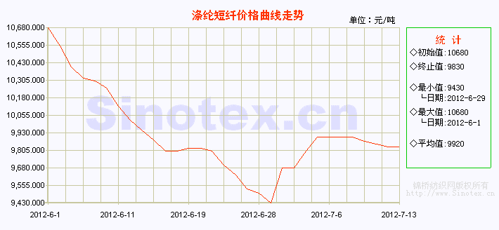 本周(7.9-7.13),原料市場行情盤整,下游紗線市場需求平淡,滌綸短纖市場呈穩(wěn)中偏弱走勢。周初二日,滌綸短纖橫盤整理,觀望氣氛濃厚,前期偏高報(bào)價適度回調(diào)。受隔夜原油下跌及下游需求疲弱的影響,11日(周三)以后交易重心弱勢下調(diào),市場買氣低迷,成交明顯縮量。滌綸短纖企業(yè)開工負(fù)荷維持平穩(wěn),產(chǎn)銷率下滑,優(yōu)惠促銷措施再現(xiàn),經(jīng)上周消耗庫存量在七天以內(nèi),壓力不大。當(dāng)前,1.4D直紡滌綸短纖市場中心價為9800元/噸,較上周下調(diào)100元/噸,仍在萬元以下。