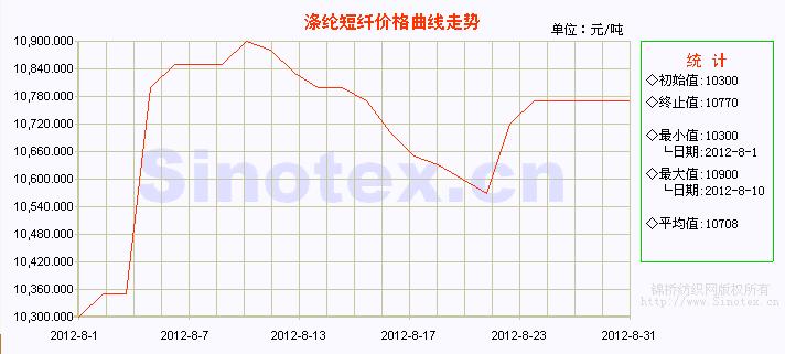 8月份滌綸短纖價格呈盤整中波動上升的走勢,先穩(wěn)定升漲運行至9日的10900元/噸的本月最高價位,此后連續(xù)下降至24日的10570元/噸的本月最低價位,月末一周又反彈回升并趨于穩(wěn)定。價格的上漲主要是受到上游PTA、MEG、聚酯切片等原料價格穩(wěn)中盤漲,致其成本堅挺和生產(chǎn)企業(yè)開工負荷基本平穩(wěn),庫存偏低(庫存量七天左右)的拉動,加之下游純滌及混紡紗、布銷售價格大穩(wěn)小漲的支持,以及月初臺風致江、浙、滬等地交通運輸中斷的影響。而中期的下跌,則一是上游PTA、MEG、聚酯切片等原料價格下滑回落的打壓;二是下游純滌及混紡紗、布銷售受阻,價格回落的拉拽。8月份全月統(tǒng)計,滌綸短纖的價格累計上漲了470元/噸,漲幅為4.56%,月末運行在10770元/噸的價位上;7月累計大幅上漲了870元/噸,漲幅為9.23%。