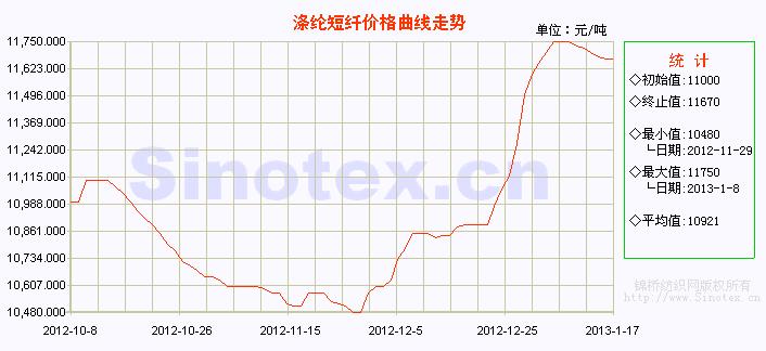 本周(1.14-1.18),受聚酯原料價格調(diào)整及下游需求不足的影響,滌綸短纖12月份以來的猛烈漲勢受到抑制,由上周的高位僵持轉(zhuǎn)為本周的小幅陰跌態(tài)勢。市場弱勢觀望,實際成交商談,交易重心下移。行業(yè)開機負荷降低,企業(yè)產(chǎn)銷率下降,庫存量略有升高,在五天左右水平。當前,1.4D直紡滌綸短纖市場中心價在11660元/噸,累計下跌70元/噸,跌幅0.60%。