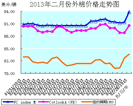 二元月份全月統(tǒng)計:紐約棉期1303合約累計微幅上漲了0.61美分/磅,漲幅為0.74%,月末運行在83.56美分/磅的價位上。國際棉花價格指數(shù)CotlookA(FE)累計微幅上漲了0.15美分/磅,漲幅為0.17%,月末運行在90.50美分/磅的價位上。中國進口棉價格指數(shù)FCIndexM累計大幅上漲了3.02美分/磅,漲幅為3.33%,月末運行在93.79美分/磅的價位上。二月末,中國進口棉價格指數(shù)FCIndexM仍分別高于近期ICE期棉1303合約和國際棉花價格指數(shù)CotlookA(FE)10.23美分/磅、3.29美分/磅。(參見:表一和2013年二月份外棉價格走勢圖)