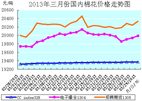 3月份全月統(tǒng)計:中國棉花價格指數(shù)CCindex328累計微幅上漲了50元/噸,漲幅為0.26%,月末運行在19375元/噸的價位上;電子撮合1304合約累計中幅上漲了249元/噸,漲幅為1.26%,月末運行在19993元/噸的價位上;鄭棉期貨1305合約累計中幅上漲了330元/噸,漲幅為1.65%,月末運行在20330元/噸的價位上。月末,現(xiàn)貨CCindex328價格比電子撮合1304合約低了618元/噸、比鄭棉期貨1305合約低了955元/噸。(參見:表一和2013年3月份國內(nèi)棉花價格走勢圖)