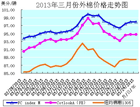 3月份全月統(tǒng)計:紐約棉期1305合約累計大幅上漲了3.17美分/磅,漲幅為3.72%,月末運行在88.46美分/磅的價位上。國際棉花價格指數(shù)CotlookA(FE)累計大幅上漲了4.30美分/磅,漲幅為4.75%,月末運行在94.80美分/磅的價位上。中國進(jìn)口棉價格指數(shù)FCIndexM累計大幅上漲了4.16美分/磅,漲幅為4.44%,月末運行在97.95美分/磅的價位上。3月末,中國進(jìn)口棉價格指數(shù)FCIndexM仍分別高于近期ICE期棉1305合約和國際棉花價格指數(shù)CotlookA(FE)9.49美分/磅、3.15美分/磅。(參見:表一和2013年3月份外棉價格走勢圖)