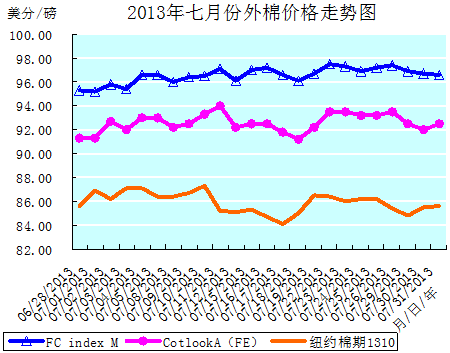 7月份全月統(tǒng)計(jì):紐約棉期1310合約累計(jì)微幅上漲0.02美分/磅,漲幅0.02%,月末運(yùn)行在85.63美分/磅的價(jià)位上,仍在80美分/磅的整數(shù)價(jià)位之上運(yùn)行。國(guó)際棉花價(jià)格指數(shù)CotlookA(FE)累計(jì)小幅上漲1.20美分/磅,漲幅1.31%,月末運(yùn)行在92.50美分/磅的價(jià)位上。中國(guó)進(jìn)口棉價(jià)格指數(shù)FCIndexM累計(jì)小幅上漲1.32美分/磅,漲幅1.38%,月末運(yùn)行在96.63美分/磅的價(jià)位上。7月末,中國(guó)進(jìn)口棉價(jià)格指數(shù)FCIndexM仍分別高于近期ICE期棉1310合約和國(guó)際棉花價(jià)格指數(shù)CotlookA(FE)11.00美分/磅、4.13美分/磅。(參見:表一和2013年7月份外棉價(jià)格走勢(shì)圖)