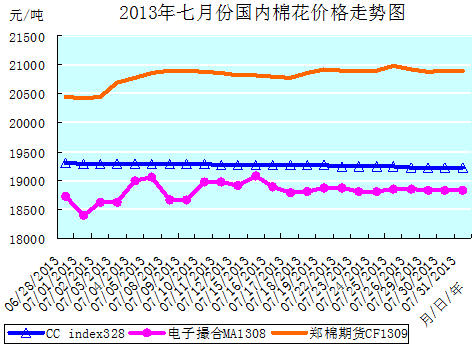 7月份全月統(tǒng)計(jì):中國(guó)棉花價(jià)格指數(shù)CCindex328累計(jì)微幅下降78元/噸,降幅0.40%,月末運(yùn)行在19222元/噸的價(jià)位上;電子撮合1308合約累計(jì)小幅上漲109元/噸,漲幅0.58%,月末運(yùn)行在18826元/噸的價(jià)位上;鄭棉期貨1309合約累計(jì)大幅上漲455元/噸,漲幅2.23%,月末運(yùn)行在20895元/噸的價(jià)位上。月末,現(xiàn)貨CCindex328價(jià)格比電子撮合1308合約高396元/噸、比鄭棉期貨1309合約低1673元/噸。(參見:表一和2013年7月份國(guó)內(nèi)棉花價(jià)格走勢(shì)圖)