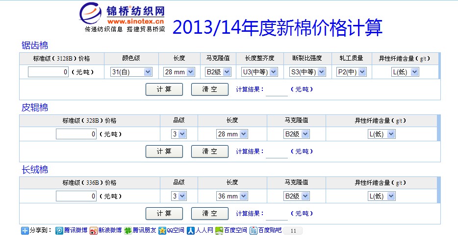 2013年9月1日起國家棉花新標(biāo)準(zhǔn)和新的棉花價(jià)格體系開始實(shí)施。計(jì)算方法相對復(fù)雜。為方便用戶快速計(jì)算新棉價(jià)格,我們推出網(wǎng)絡(luò)版《新棉價(jià)格計(jì)算》應(yīng)用工具。 該計(jì)算工具包括鋸齒棉價(jià)格、皮輥棉價(jià)格,長絨棉三種類型棉花價(jià)格。用戶只需輸入標(biāo)準(zhǔn)級價(jià)格和選擇相應(yīng)質(zhì)量指標(biāo),系統(tǒng)就會自動計(jì)算出相對應(yīng)級別的棉花價(jià)格。 本計(jì)算辦法是以《棉花國家標(biāo)準(zhǔn)GB1103-2012》和《中國棉花協(xié)會棉花質(zhì)量差價(jià)表》作為開發(fā)依據(jù),本辦法適用于2013年度棉花。 舉例:如,收儲棉標(biāo)準(zhǔn)級3128B收儲價(jià)20400元/噸,若交儲的棉花質(zhì)量分別:白棉二級、長度29mm、馬克隆值B1、長度整齊度為高、斷裂比強(qiáng)度中等、軋工質(zhì)量中、異性纖維含量無。測在標(biāo)準(zhǔn)級棉下輸入20400,然后選擇上述質(zhì)量對應(yīng)項(xiàng),點(diǎn)“計(jì)算”,得21250元/噸。 具體計(jì)算請進(jìn)入操作頁面進(jìn)行操作:http://m.qdhqly.cn/office/cotton.asp