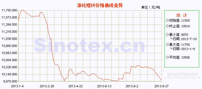 【錦橋紡織網(wǎng)專稿】本周(9.21-27),滌綸短纖繼續(xù)弱勢(shì)下行,擴(kuò)幅續(xù)跌,價(jià)格在萬元關(guān)口岌岌可危。市場成交水平努力維持,氣氛冷清,實(shí)際成交商談優(yōu)惠普遍,優(yōu)惠幅度維持。市場看跌心態(tài)濃重,節(jié)前備貨意愿寡淡。目前行情一方面是由于上游聚酯原料市場的調(diào)整,對(duì)滌綸短纖市場的支持力度下滑;另一方面,下游紗線企業(yè)的需求仍未得到改善,市場信心不佳。目前滌綸短纖企業(yè)產(chǎn)銷率處于五到七成之間的水平,企業(yè)庫存量上升至十天以上。 9月27日,1.4D×38mm滌綸短纖市場價(jià)格運(yùn)行在10010元/噸(比當(dāng)日國內(nèi)328級(jí)棉花現(xiàn)貨價(jià)格低9152元/噸,價(jià)差較之前擴(kuò)大),本周累計(jì)下跌175元/噸,跌幅0.44%。截至9月27日,本月滌綸短纖市場價(jià)格累計(jì)下跌320元/噸,跌幅3.10%。 表一 化纖原料價(jià)格運(yùn)行明細(xì)表