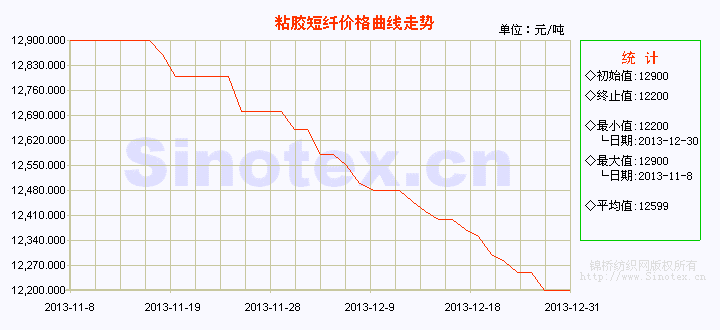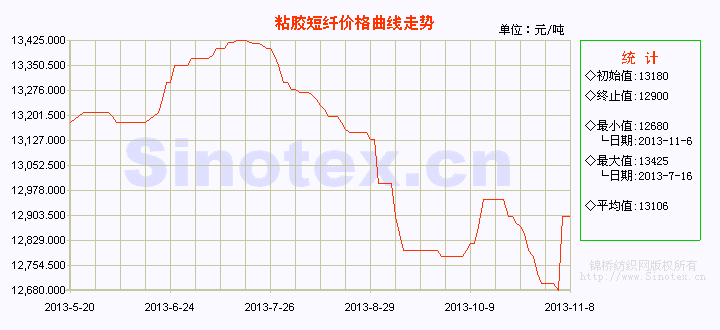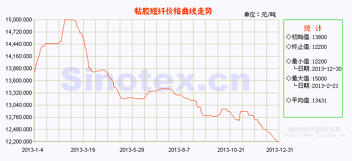 【錦橋紡織網(wǎng)專稿】2013年粘膠短纖全年運行呈前高后低的態(tài)勢,運行格局和2011年、2012年極相似。全年最高值出現(xiàn)在農(nóng)歷春節(jié)后的2月21日,為15000元/噸;最低值出現(xiàn)在年底,為12200元/噸,最高值和最低值相差2800元/噸。年底的12200元/噸也是粘膠短纖近幾年來的低位,較同期國內(nèi)3128B級棉花現(xiàn)貨價格低7334元/噸,較2012年末的13750元/噸下跌1550元/噸,年跌幅11.27%。據(jù)粘膠短纖全年的運行情況,以下劃分為4個階段來分析。