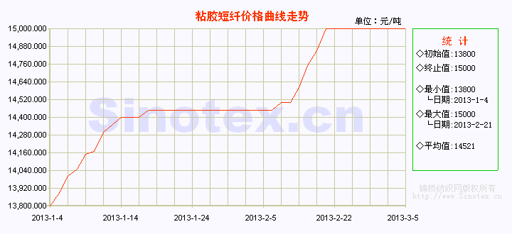 春節(jié)假期前的2013年2月6日,商務(wù)部發(fā)布公告稱對原產(chǎn)于美國、加拿大、巴西的進(jìn)口漿粕進(jìn)行反傾銷調(diào)查立案。此消息的影響在春節(jié)假期結(jié)束粘膠短纖生產(chǎn)廠家陸續(xù)開工后得以顯現(xiàn),粘膠短纖廠家普遍對報價試探性拉漲,由此而致2月下半月前期(18-21日)粘膠短纖價格連續(xù)上漲至本年度的最高值15000元/噸后高位持穩(wěn)。粘膠廠執(zhí)行前期訂單,廠家?guī)齑娴臀?,價格松動意向不大;下游消化原料庫存保持觀望;且受到原料漿粕價格支撐,因此粘膠短纖價格高位僵持至3月5日。