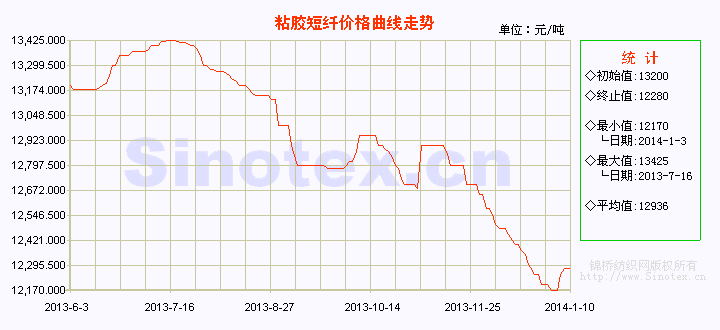 【錦橋紡織網(wǎng)專(zhuān)稿】2014年元月份第2周(1.4-10),粘膠短纖交易有所好轉(zhuǎn),廠(chǎng)家報(bào)價(jià)上調(diào),中端商談重心較前期有百元上浮。6日部分高端廠(chǎng)家產(chǎn)銷(xiāo)輕松超百,整體訂單超簽至1月下旬水平,低價(jià)表現(xiàn)惜售。7日唐山三友、翔盛、賽得利等報(bào)價(jià)多上調(diào)200元。報(bào)價(jià)普漲后,下游采購(gòu)積極性暫不高,不過(guò)低價(jià)基本得到取締,粘膠短纖價(jià)格基本筑底。周末粘膠短纖價(jià)格指數(shù)運(yùn)行在12280元/噸價(jià)位上(比當(dāng)日國(guó)內(nèi)3128B級(jí)棉花現(xiàn)貨價(jià)格低7197元/噸,價(jià)差有所縮小),本周累計(jì)上漲110元/噸,漲幅0.90%。