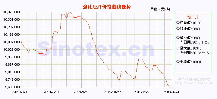 中石化公布2014年1月聚酯切片合同結(jié)價:半光切片9200元/噸,有光、工業(yè)絲切片9300元/噸,全消光切片10000元/噸。2014年1月中石化滌綸短纖結(jié)算價出臺:其中1.4D半光滌綸短纖報價10100元/噸;1.2D有光滌綸短纖報價10600元/噸,較上月下跌100元。