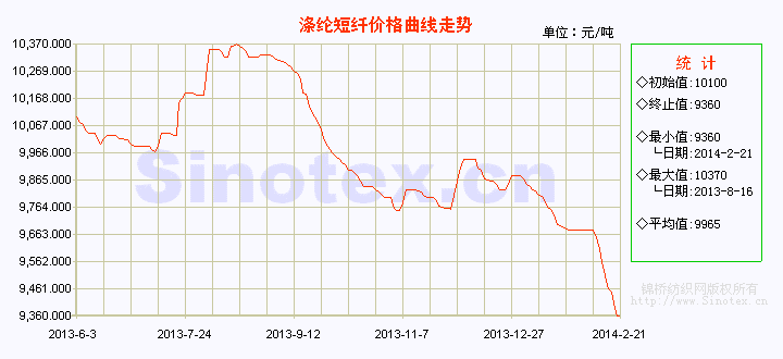 春節(jié)后江浙織機開工率略有回升至48%,聚酯工廠維持65%左右水平。2014年2月中石化滌綸短纖結(jié)算價出臺:其中1.4D半光滌綸短纖報價9850元/噸;1.2D有光滌綸短纖報價10350元/噸,較上月下跌250元/噸。