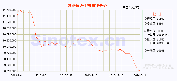 【錦橋紡織網專稿】3月份的第二周(3.8-14),滌短市場繼續(xù)弱勢前行,擴幅續(xù)跌。上周聚酯大盤略有企穩(wěn),本周又重回弱勢,滌短上游原料PX大幅下滑,PTA、MEG止?jié)q回調,滌短止跌無望。市場整體觀望氣氛濃厚,利好難尋。下游心態(tài)受挫,采購縮量,詢盤氣氛清淡。聚酯大盤整體心態(tài)悲觀,預計下周滌短仍有一定下跌空間,后期現金流或將不保。后市須密切關注原料走勢。3月14日,1.4D×38mm滌綸短纖市場價格運行在8850元/噸(比當日國內3128B級棉花現貨價格低10595元/噸,價差擴大),本周累計擴幅下跌150元/噸,跌幅1.67%。